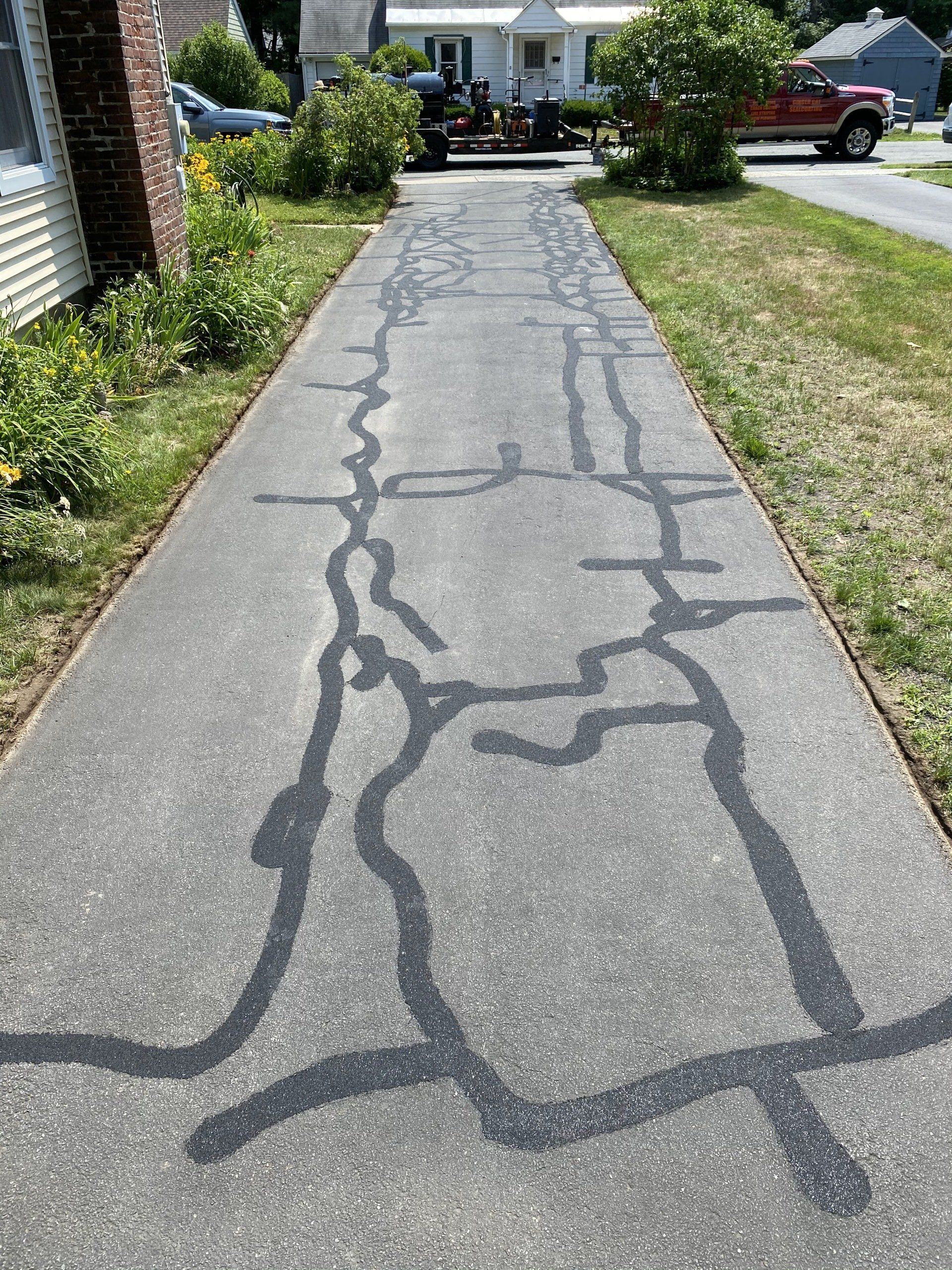One important thing to note about hot rubber crack sealing is that rubber shrinks slightly as it cools. We make every effort to completely fill cracks with rubber while we are performing this service. As the rubber cools over the next 12 hours it will shrink to an extent. This can lead to a slightly sunken look to the crack sealing on wider and deeper cracks. This sinking does not mean the crack is not adequately sealed. It just means the rubber has cooled, condensed and shrunk to its final size.